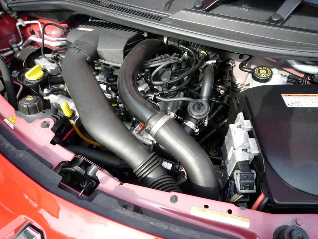 トゥインゴGTのターボチャージド1,148ccエンジン。くねる吸気パイプ。