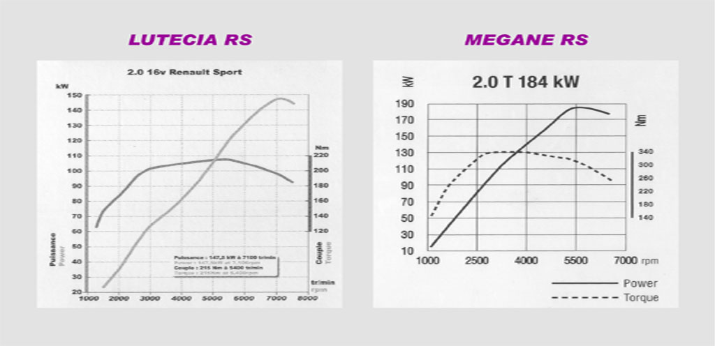 ルーテシアRSの1,988ccNAエンジンとメガーヌRSの1,988ccターボチャージドエンジンの性能曲線。