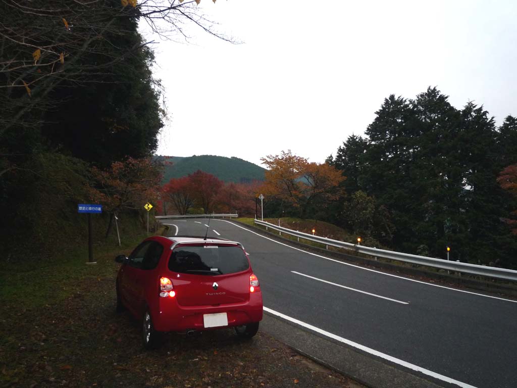 天気予報がみごとに外れどんよりとした曇り空を見上ながら走るものの、【晴天・紅葉・トゥインゴ・見晴らし】を実現できると思っていたものだから、いささか意気消沈。今回は仰木ゲートから10キロほどのところにある峰道レストランの駐車場で折り返しすことにした。それでも比叡山の雄大さを感じることはできた。