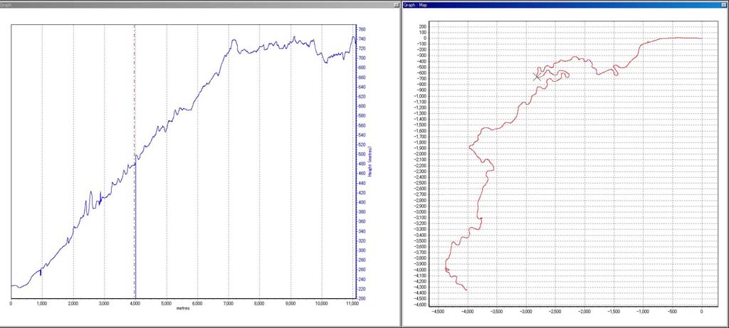 ワインディングロードを走るのだからとデータを取ってみた。右の図は仰木ゲートから峰道レストランの先にある検札所までの軌跡。走った時はもっとたくさんのコーナーをクリアしたように思えたものだが。左の図は標高を示す。仰木ゲートが230mぐらい。7キロで740mまで駆け上がったことがわかる。