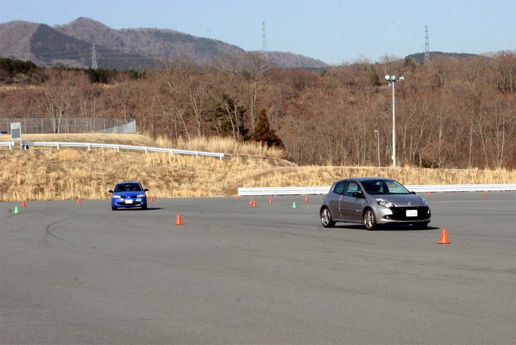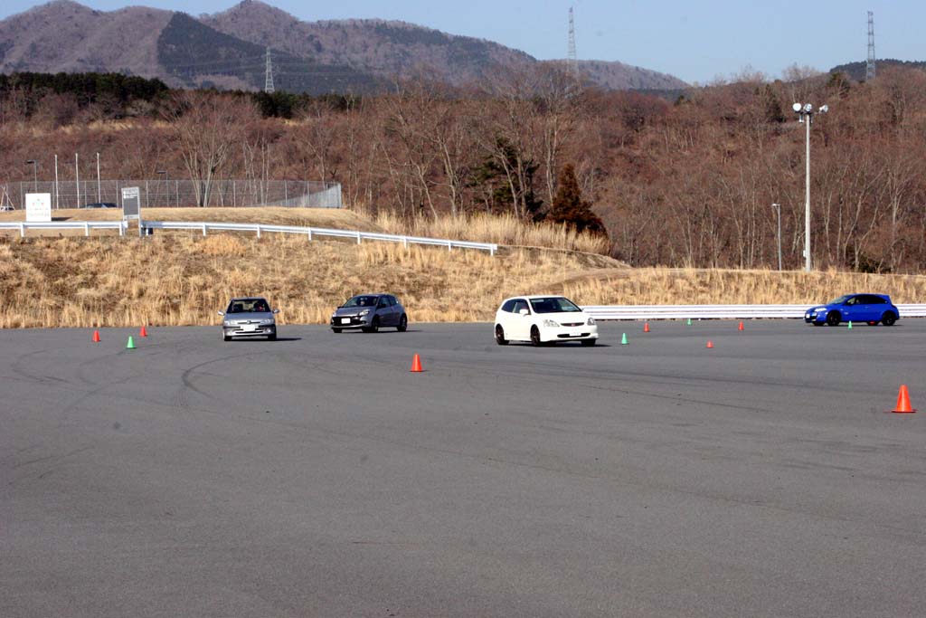 次に、ヒールアンドトウを使うとどんなメリットがあるのかを説明し、その目的からさかのぼってブレーキング中のどの時点でシフトダウンすることが好ましいか確認してもらった。最後に、実際にヒールアンドトウの操作をする時のコツを「止まっているクルマのシートを一番後ろに下げ」て右足の動きを見てもらいながらイメージしてもらった。
