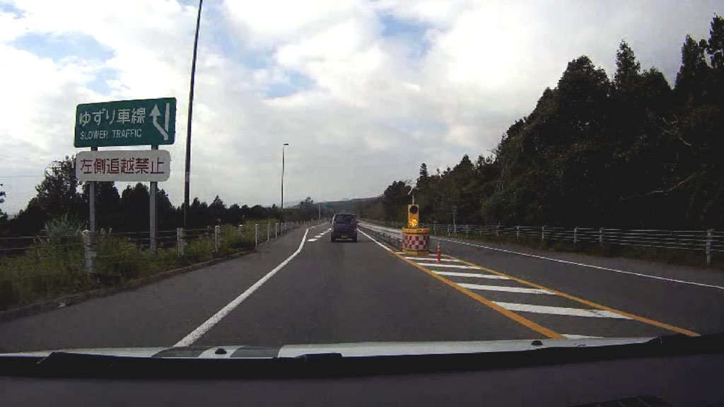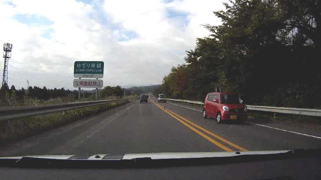 もともとは有料道路だったのだが、国道の渋滞を解消するために全線追い越し禁止にして無料開放されたとか。ところが流入量が増えたのが理由(?)で正面衝突事故が多発(!)したとかで、低速走行車を追い越せるように部分的に2車線化したそうな。もともと片側1車線で設計された経緯から、ゆずり車線は本来の車線の左側に張り出す形で設けられている。そのゆずり車線の走り方の話。