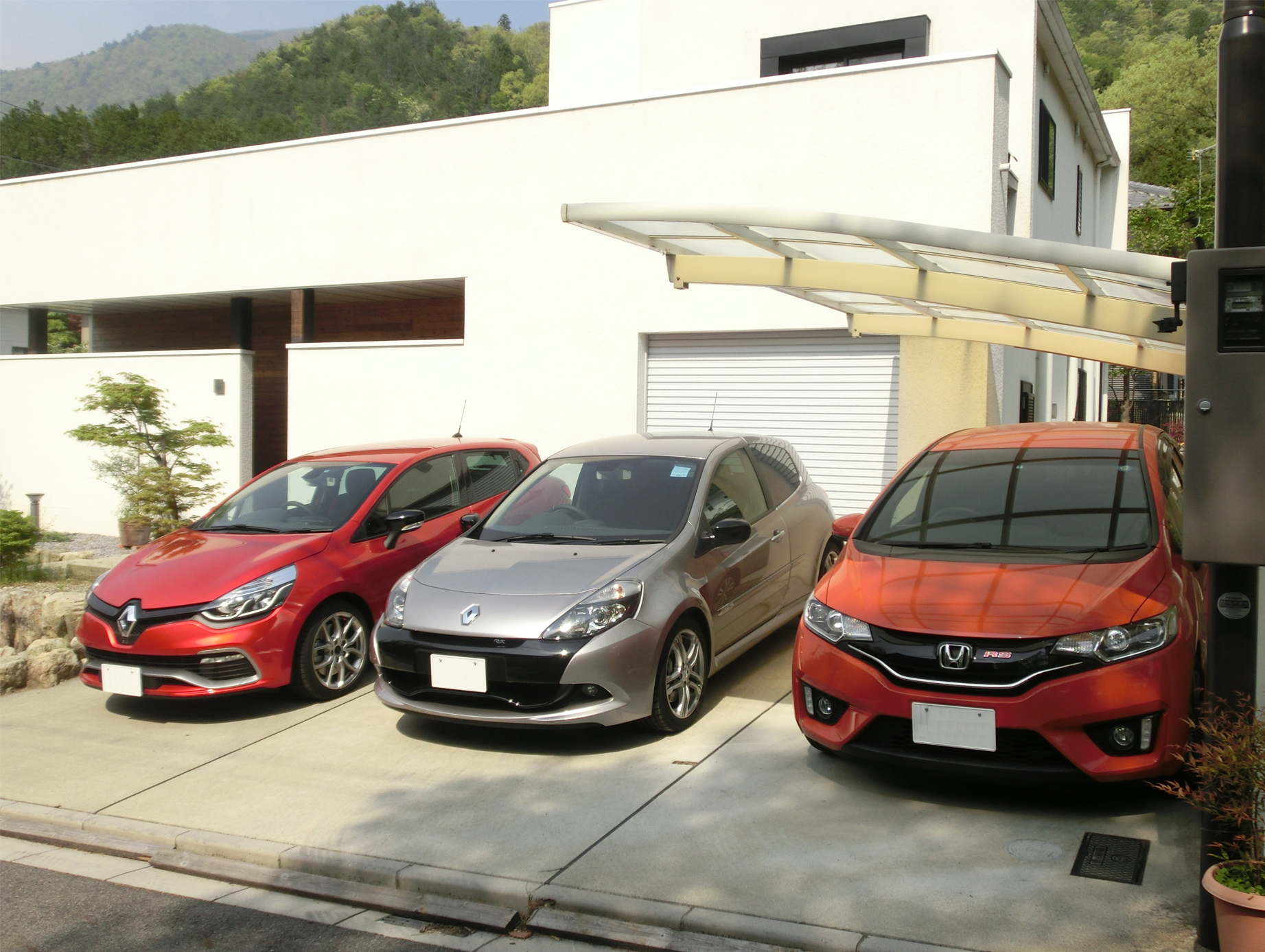 ふだんの足として使用頻度が最も多い、なんちゃって7段パドルシフトのフィットRS。雨の日には乗らずに老後の楽しみ(?)にとってあるルーテシアⅢRS。ルノー・ジャポンからお借りしていてドライビングスクールで大活躍のルーテシアⅣRS。
