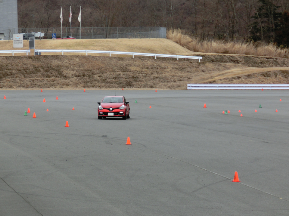 半径22mのコーナーは時速45キロだとどんなクルマでもパイロンに沿って走ることができる。ところが、「それでは50キロにペースを上げて下さい」と言うと、何人かがパイロンに沿って走ろうとしているのにパイロンから離れるようになる。「次に55キロまで加速してみましょう」と言うと、かなりの人がパイロンに沿って走ることができなくなる。パイロンを後輪で踏んづけて倒す人が出てくるのが、「あと2、3キロ速く走ってみましょうか」と言う頃だ。そう、おわかりだろう。ステアリングを「バキッ」と切っているのだ。内輪差などおかまいなしに。
