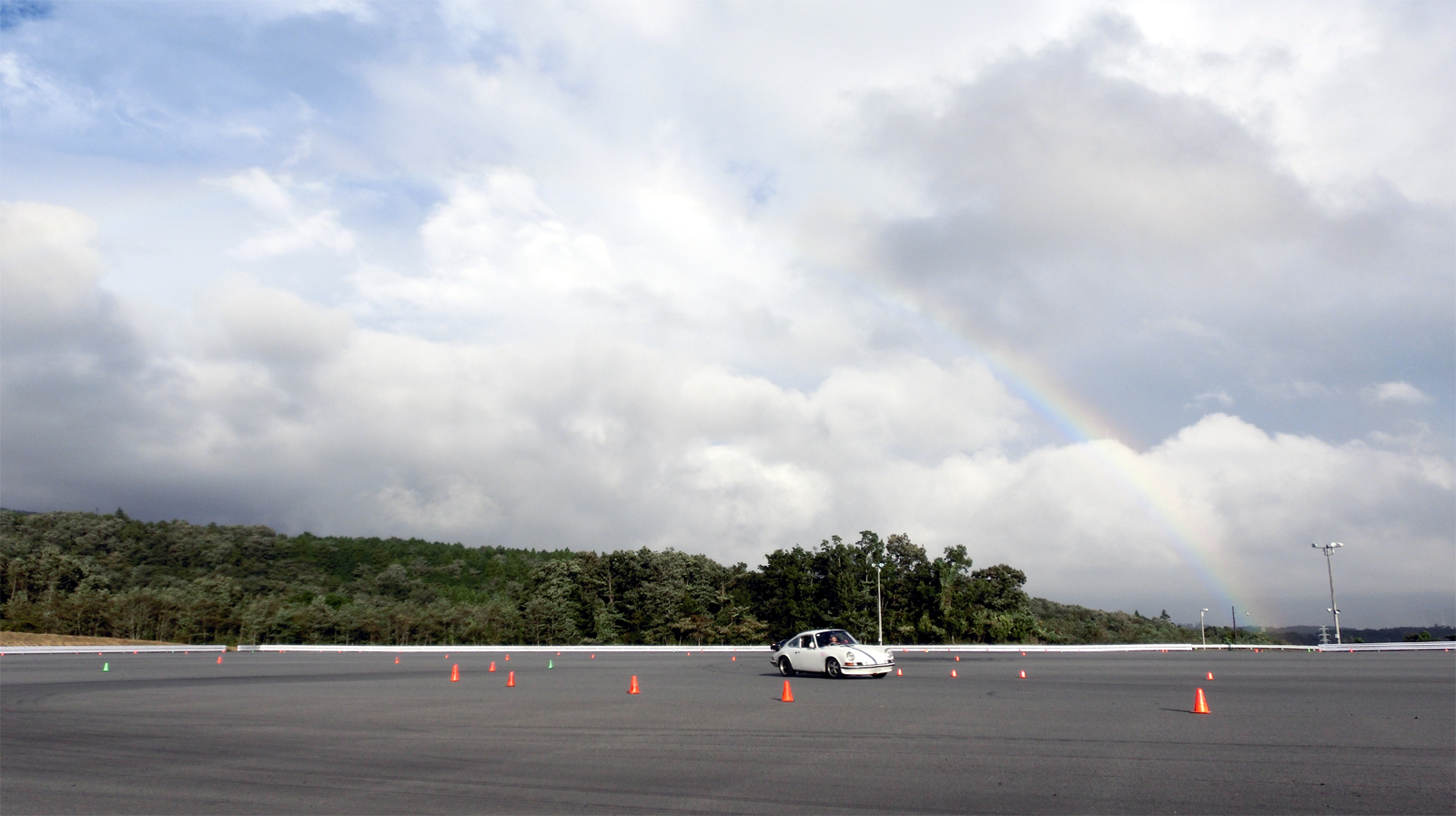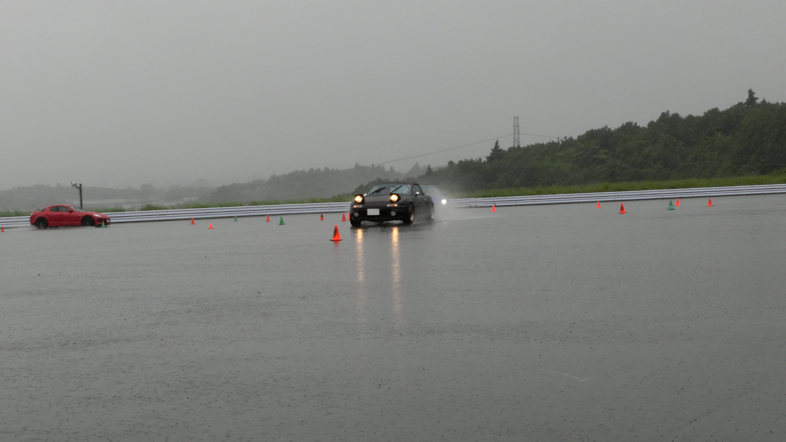 雨が降ると参加者に「今日はラッキーですね」、「今日はお日柄もよく」といつも言うものだから、常連はもちろん初めて受講する人もウエット路面に対する抵抗感は少ない。せっかく練習するのだから、操作が正しいかどうかはっきり結果の出る雨は願ったりかなったりではないか。