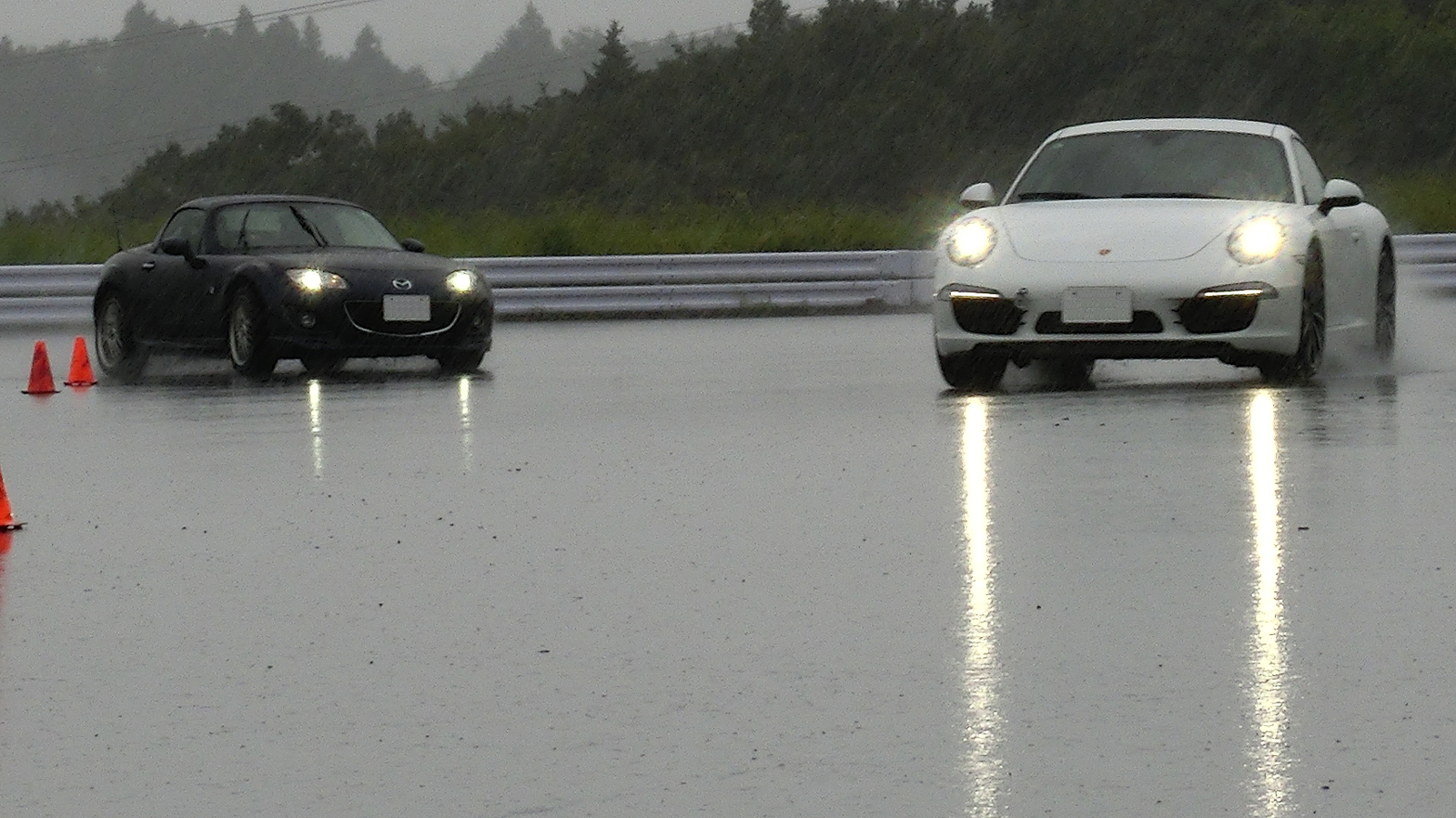 クルマの性能はそれまでと同じなのだけど、タイヤが接している路面のほうの摩擦係数が小さくなるので、タイヤが路面をつかむ力は低くなるし限界を超えた時の挙動も唐突になるのは事実ではある。だけど、短絡的に雨は危ないと決めつけて消極的になり、ウエット路面での操作を積極的に学ぼうとしない人が多いのはドライビングスクール主宰者としては残念だ。