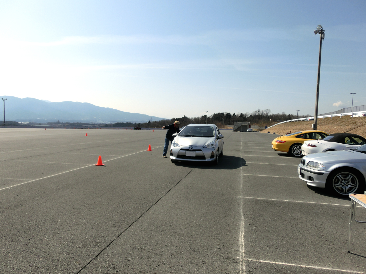 止まれる速度の手前まで減速して赤のパイロン付近でノーズを拾い前後均等加重にもっていく