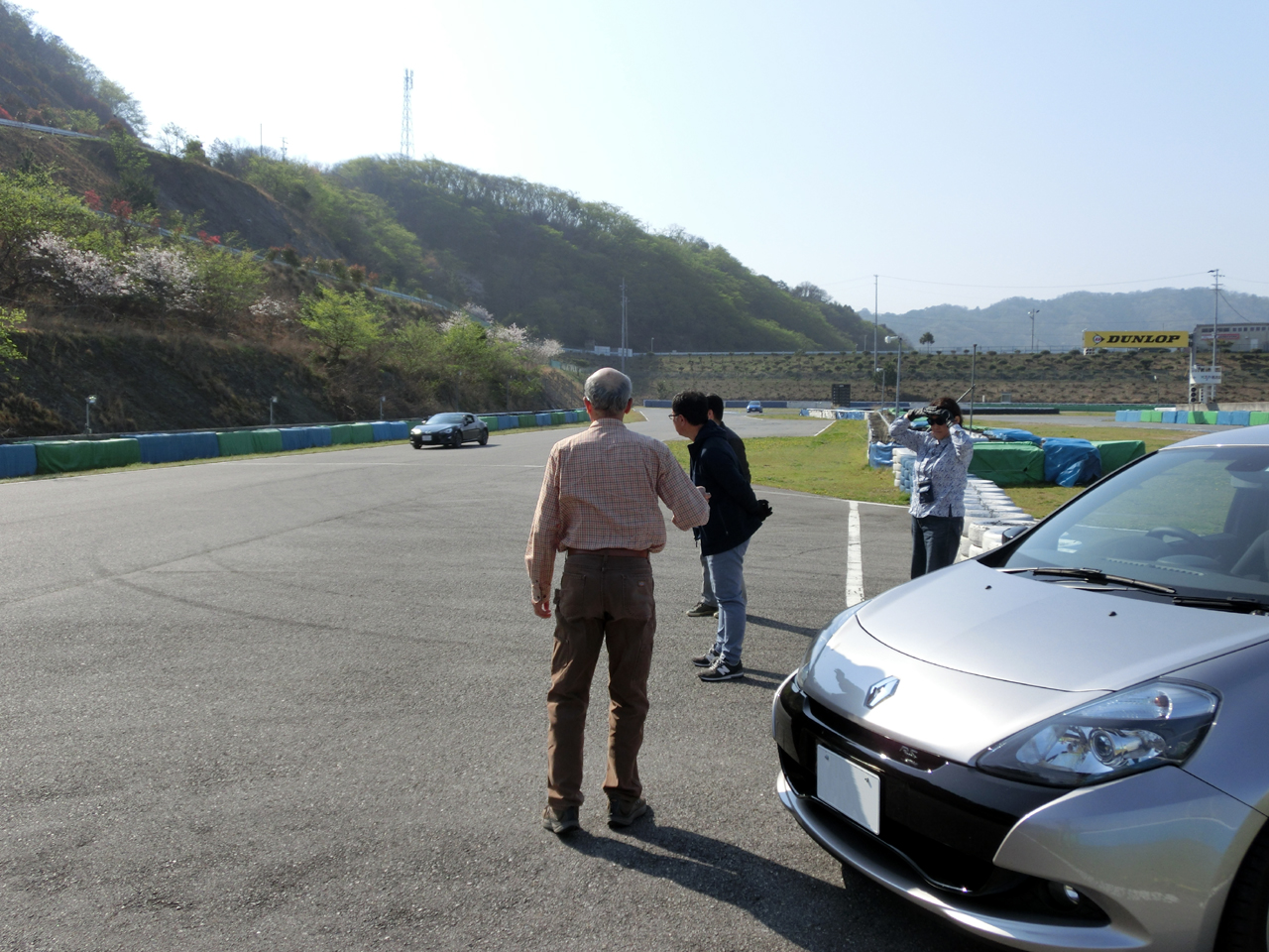 それから金魚のなんとかみたいにインストラクターの後ろについて徐々にペースを上げて走るリードフォローをやって、それからオーナーに助手席に乗ってもらってインストラクターが運転操作コツを見せる同乗走行をやって、走りのイメージができたところで、初めて参加者自身が単独走行に。