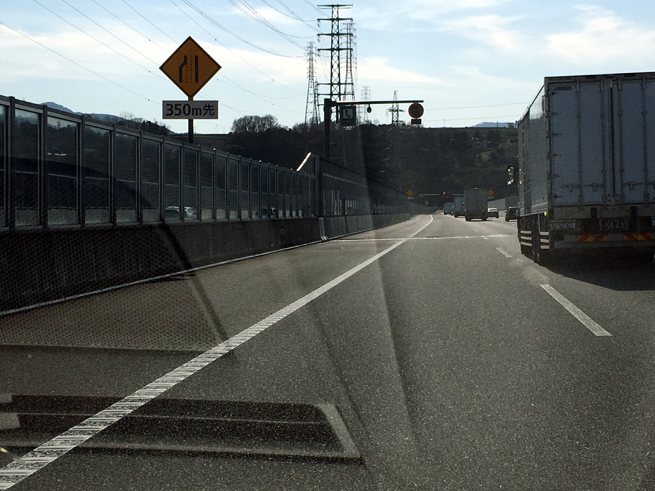 3車線から2車線への車線減少の最初の標識は1キロ手前には現れる