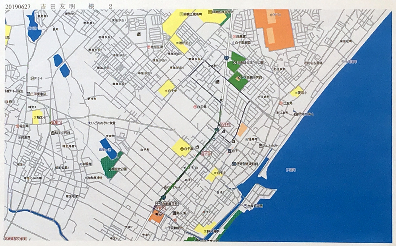 運転レポートと一緒に渡される走行したルートが記録された地図には4ヶ所の赤枠
