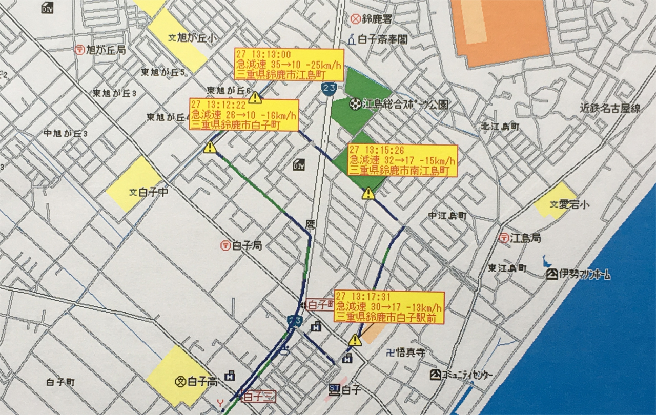 何時何分にどこで何キロから何キロへの減速を行ったかが一目瞭然