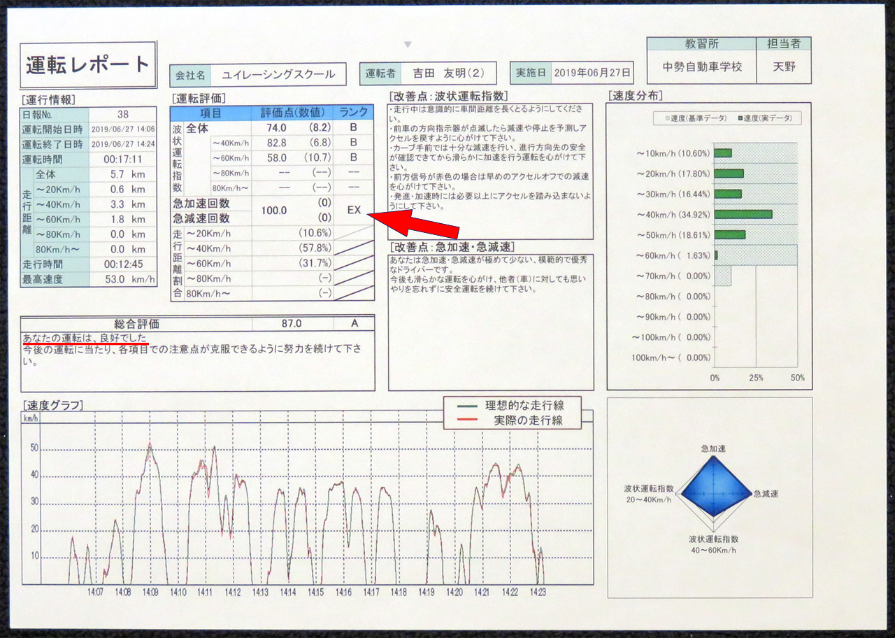 急加速急減速回数がともにゼロになって運転評価はEX=エクセレント