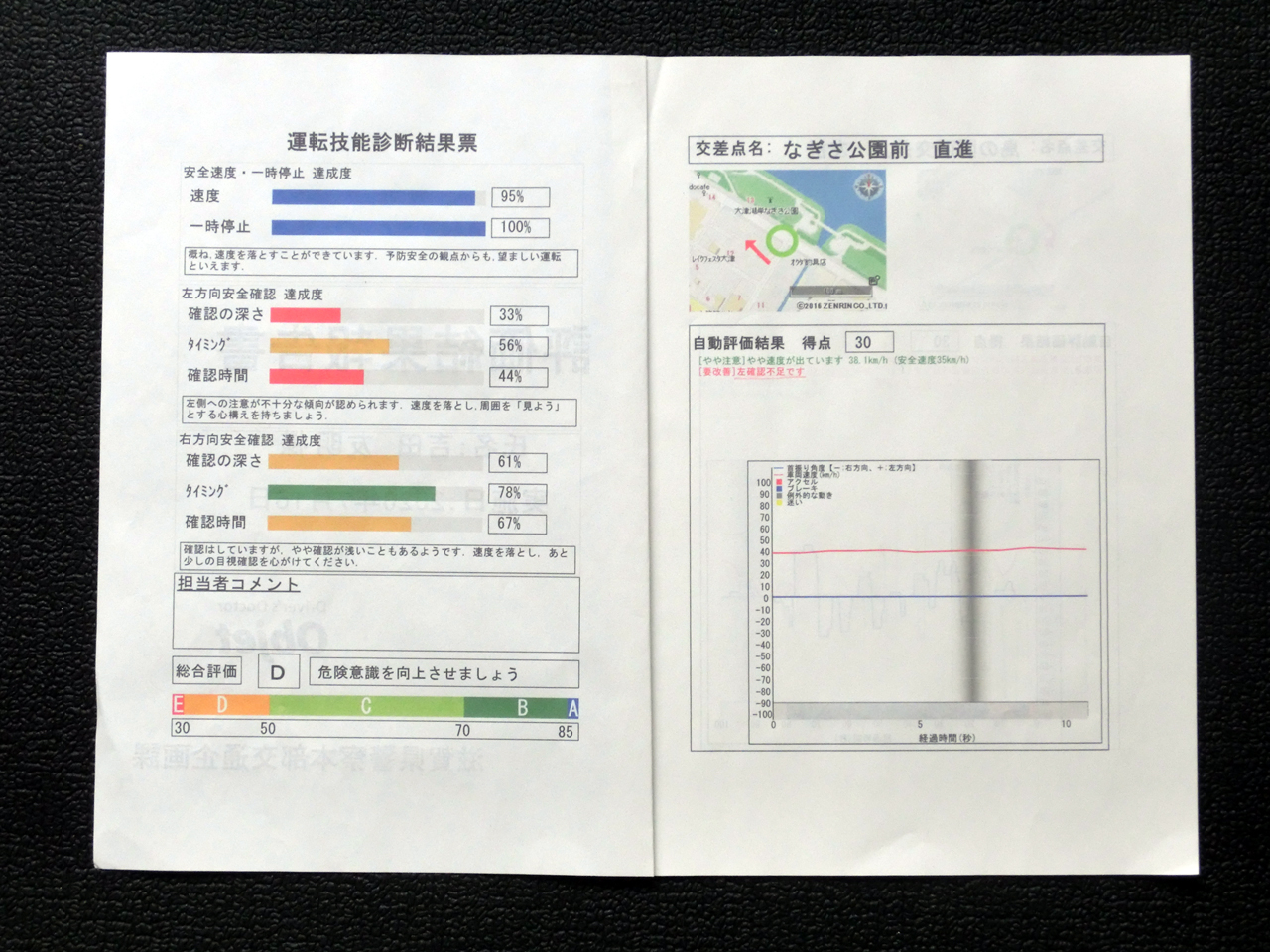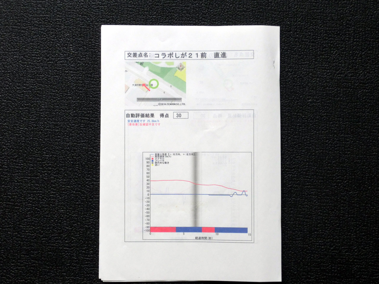 昨年のブラッシュアップ講習の際は、ブレーキング時に減速Gが大きすぎて減点された。ブレーキング開始から停止までの間を同じような率で速度を落とすより、イニシャルで大きく速度を落としたほうが安全だと思ってやっているのだけど、ブラッシュアップ講習のプログラムはもう少し長い距離でもっとなだらかに減速することを是としていた。