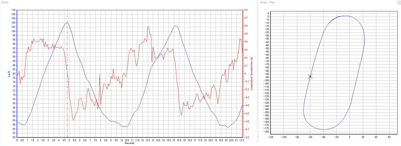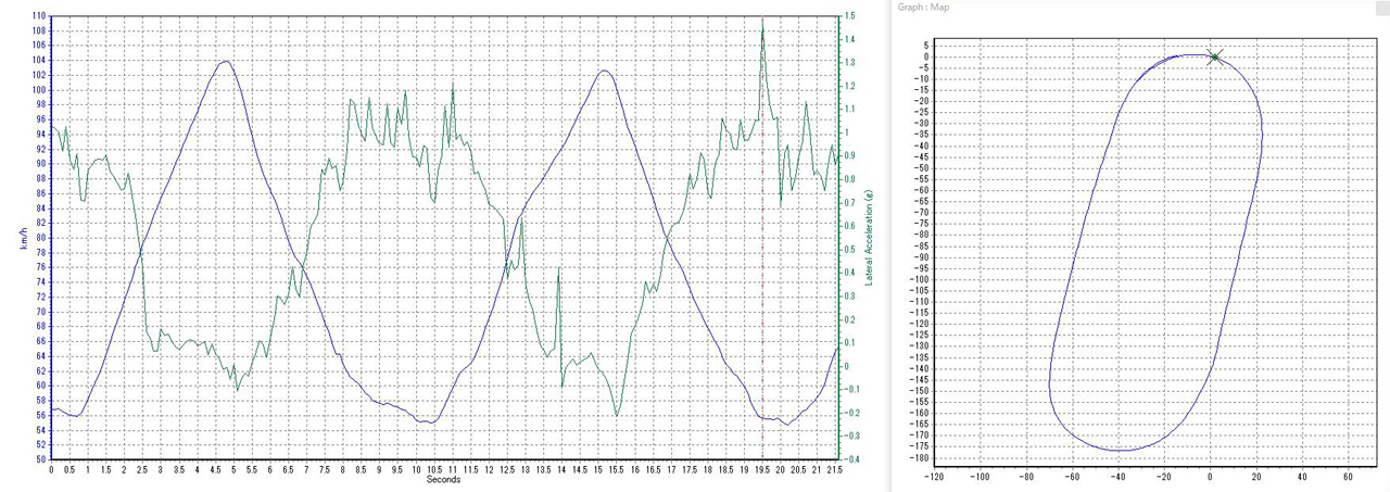 パフォーマンスボックスで拾ったデータで青線が速度(左目盛)で緑線が横G(右目盛)