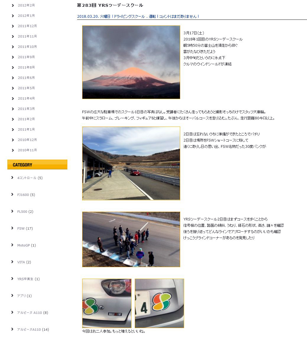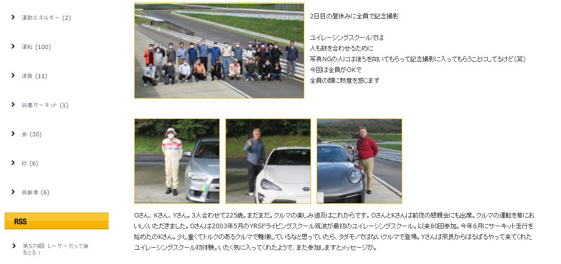 それほど遠くない将来、もうあの背筋がゾクッとくる刺激が味わえなくなる日が来そうなのだから。そして、わが国では車歴13年を超えると維持するのが重荷になってしまうけど、旧モデルのRSを含めできるだけたくさんのRSの個体がクルマ好きの手によって日本の道を走り続けてほしいと思うから。RSはただただ楽しむために走らせる価値が十分にあるクルマであることは間違いないし、スクールに来てくれれば楽しみを倍加させる方法は教えることができますから。