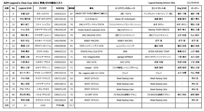 リジェンドクラブカップレースはモータースポーツ界で活躍してきた名ドライバー達がVITAというマシンで戦うワンメイクレース。今回は最高齢87歳の多賀さんを初めとする17名が参加予定。お遊びではなく本当の本当の真剣勝負に参加するドライバーの平均年齢は72.7才です。みなさん競技ライセンスもお持ちです。驚いて下さい。