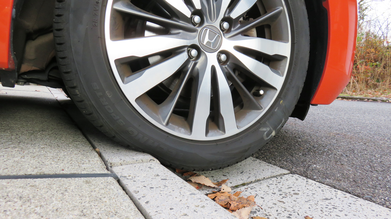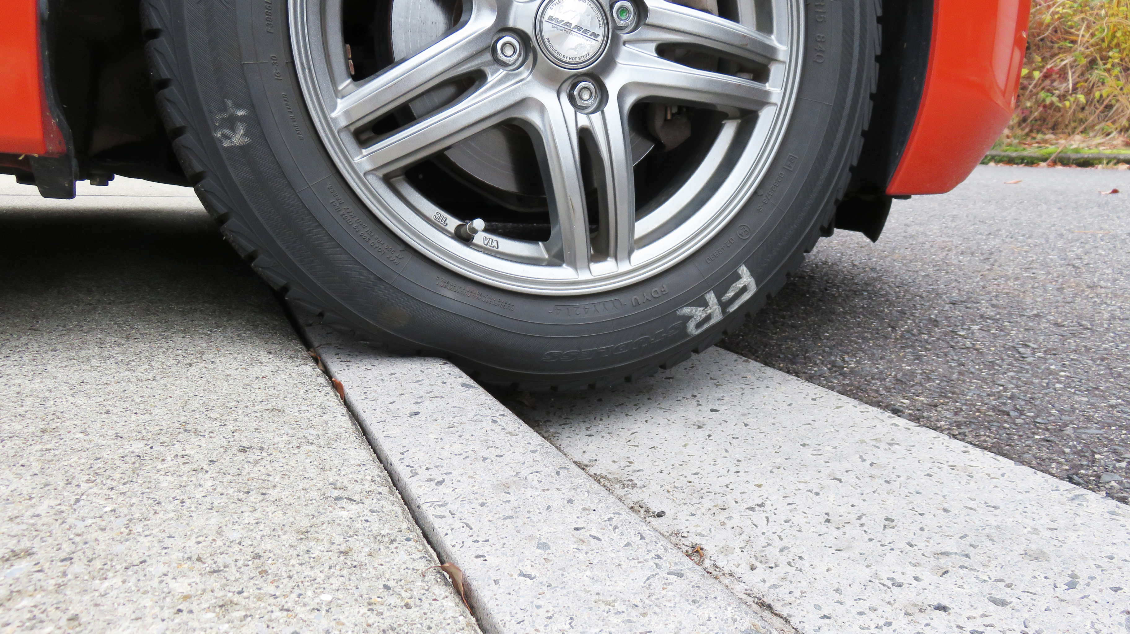 で、夏タイヤとスタッドレスタイヤがまさに段差を乗り越える時の写真を撮ってみた。そしたら両方とも思いのほか変形量が大きくて驚いた。撮影した条件が全く同じとは言えないから断定はできないけど、量的にはスタッドレスタイヤのほうがより変形しているか。