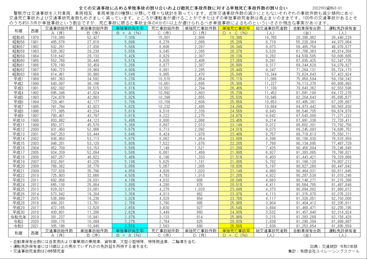 免許人口の増加や車両保有台数の多さを考慮すると、発生した交通事故件数から見た我が国の道路交通はずいぶんと安全な方向に向かっていることが資料8-01の数字から読み取れる。