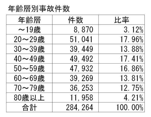事故発生件数から見れば決して高齢者の事故が多いわけではない。参考のために全人口に占める年齢別構成比と交通事故総件数に占める事故件数を調べてみた。30~59歳が人口の38.9%を占め交通事故の48.1%を起こしている。一方60~89歳は人口の32.8%で起こした事故は30.8%だ。