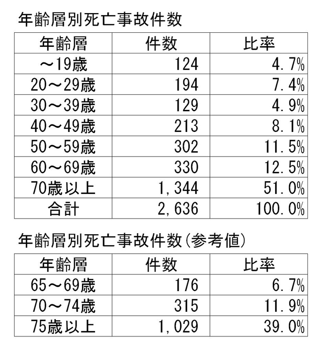 現状を認識するために改めて年齢層別に交通事故の数字をまとめてみた。左の表が交通事故件数で右が死に至った交通事故件数でともに令和3年度の数字だ。