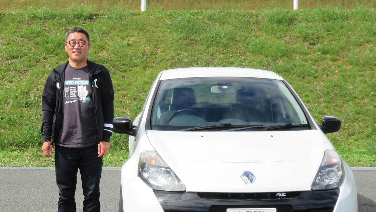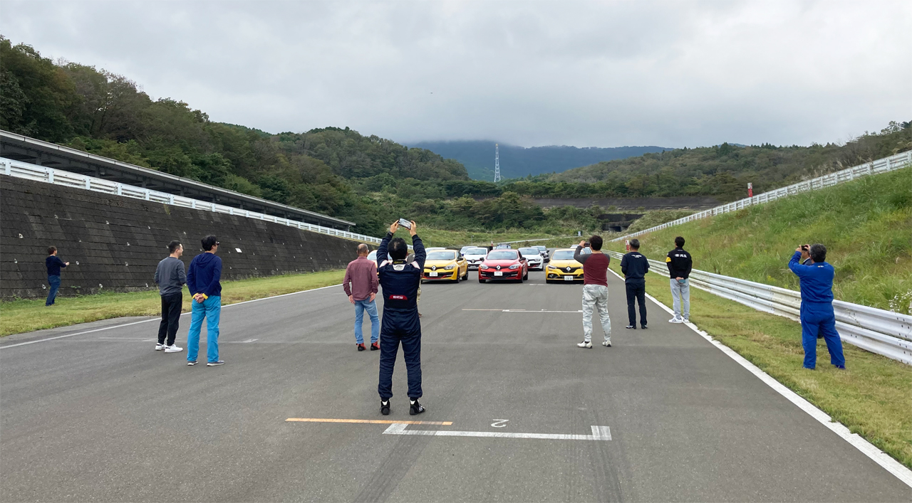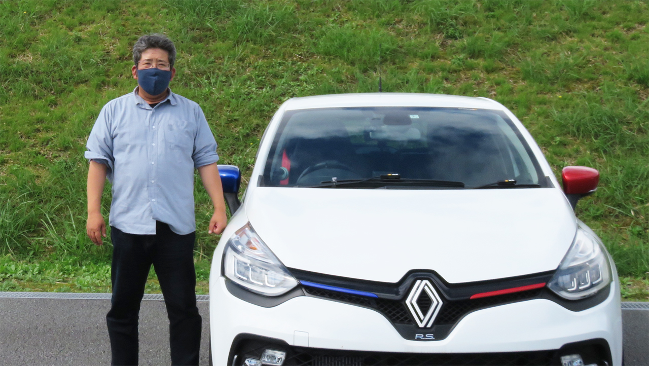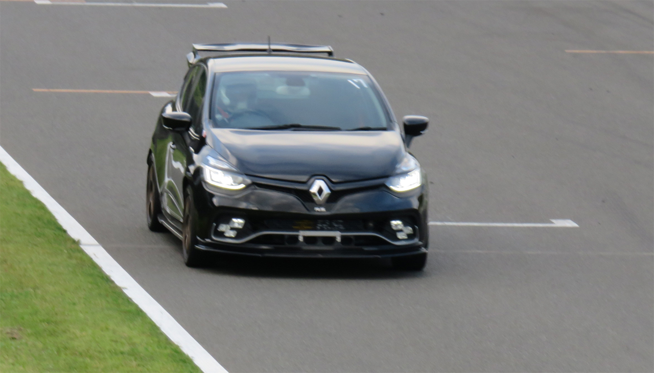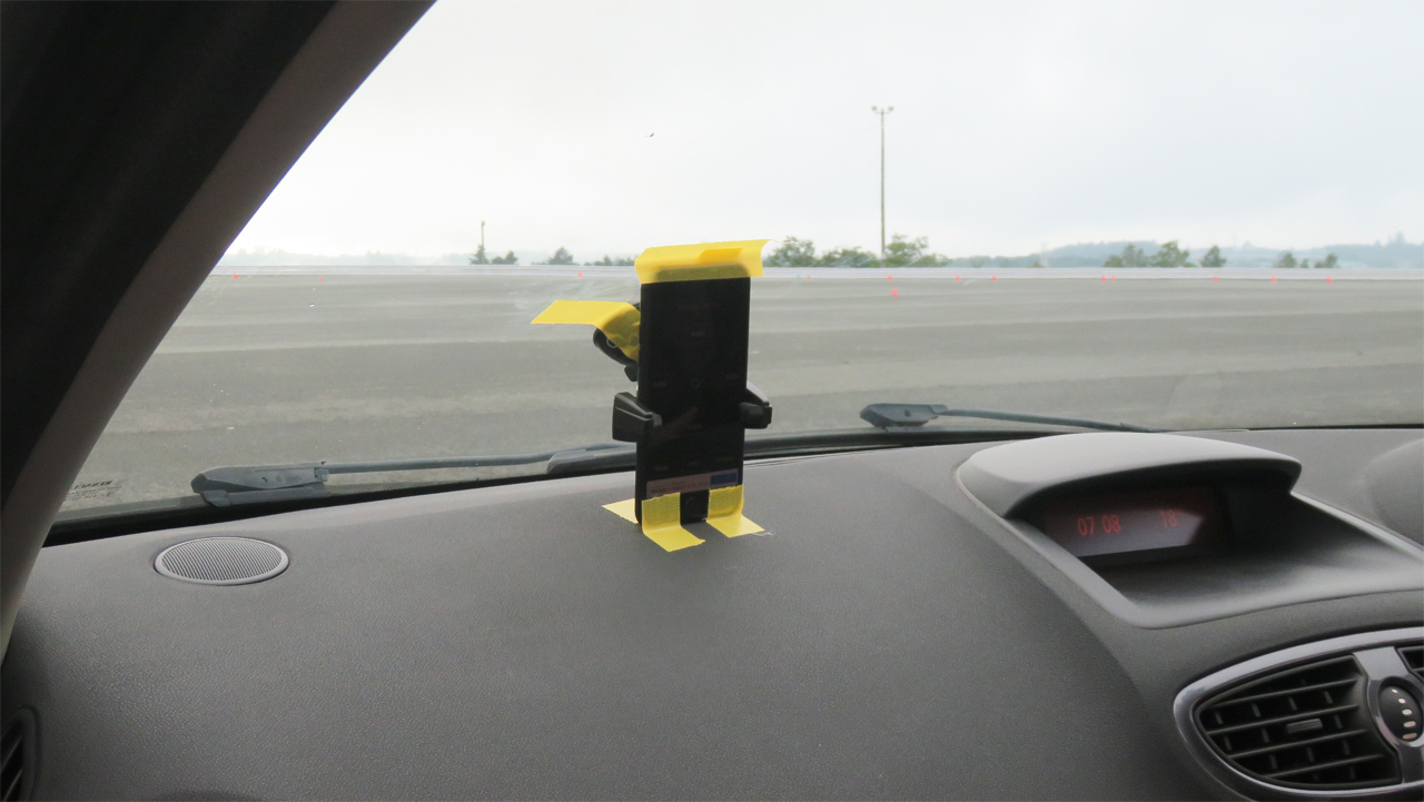今回は初めて試したので便宜上写真のようにスタッフYのクリオRSのフロントウインドウに取り付けた。本来ならホイールベースの中心付近に取り付けるべきなのだろうけど、ここはアプリの作動を確認するのが目的なので。