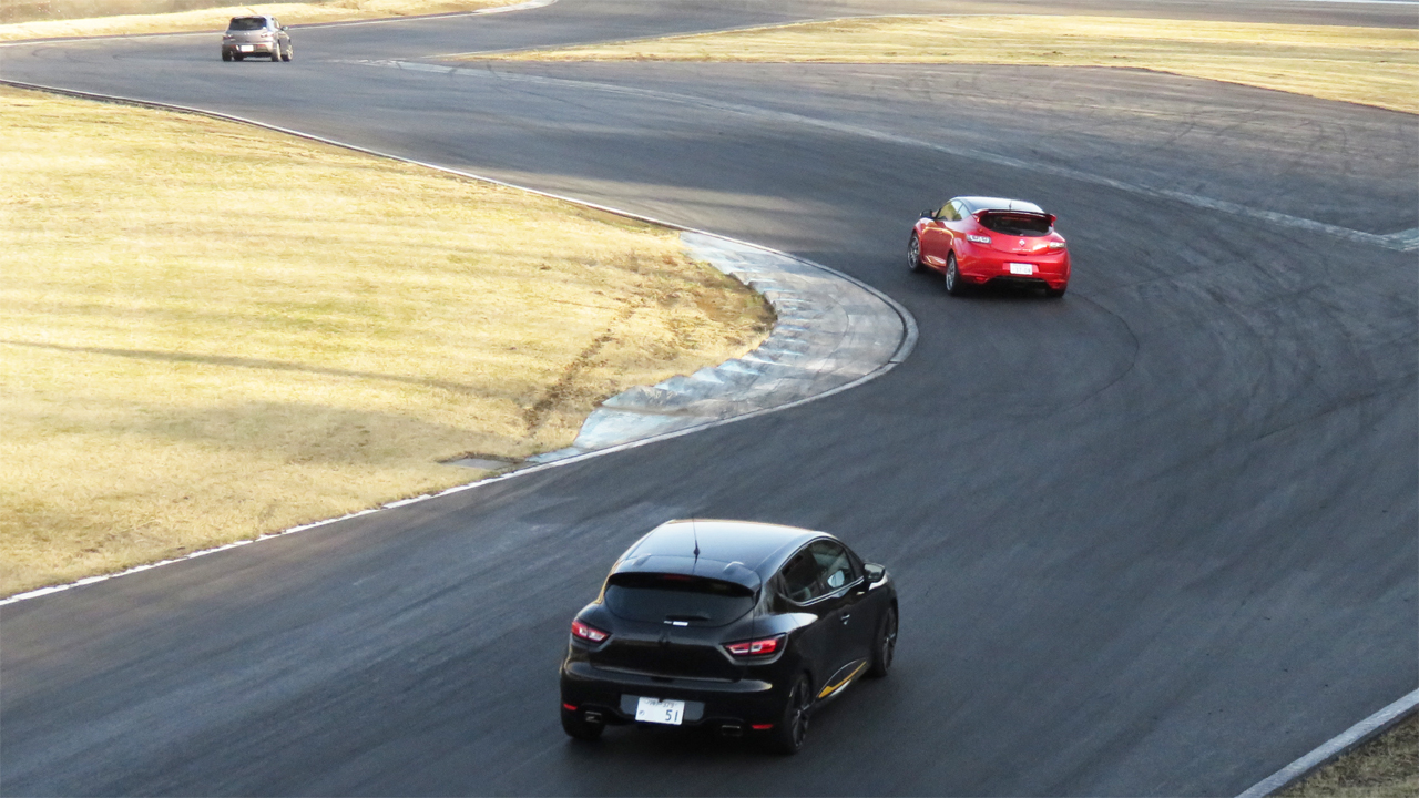 KさんのルーテシアRSはピッチングすることもなく、気をつけていないとそれとわからないぐらいのアンダーステアとオーバーステアを繰り返しながら、要するにホイールベースの間のどこかを軸としてプラスとマイナスの自転を繰り返しながら円運動を続ける。コーナリング速度が高いからこそなせる技。ターンインから立ち上がりの舵角ゼロまで前後輪のスリップアングルの和が等しくなるのを目指す。