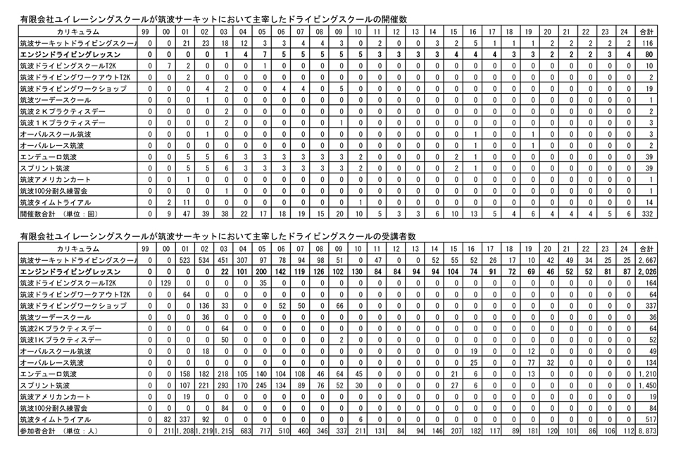 ユイレーシングスクールが筑波サーキットで主宰したドライビングスクール一覧