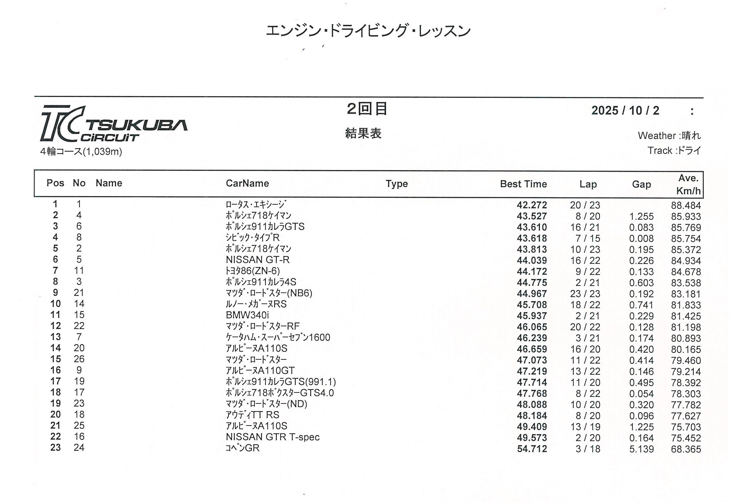 午前中のジムカーナ場でイーブンスロットルとトレイルブレーキングの練習をみっちりやった効果で、コース1000を参加者全員がクルマのバランスを崩すことなく周回。速さについては見るものがあるので、次のテーマは一貫性というか再現性の向上。無意識に操作ができるようになれば速さはあとからついてくる。