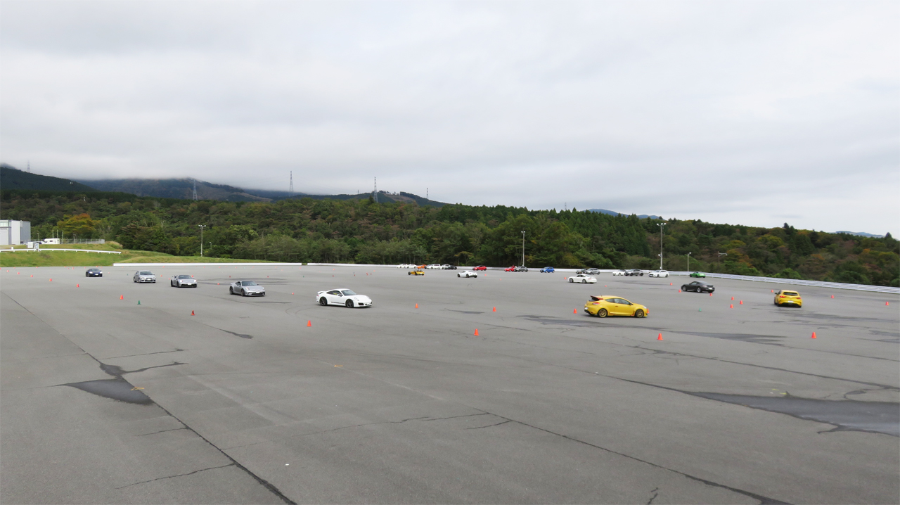 1日目は広大な駐車場でイーブンスロットルとトレイルブレーキングをマスターするためにスラローム、ビッグブレーキ、スモールブレーキ、オーバル走行の練習。