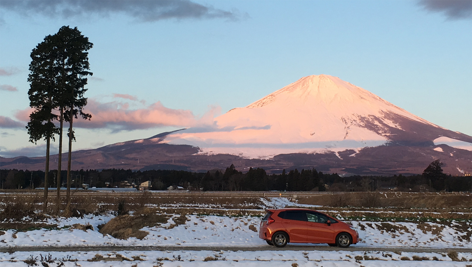 富士山に積もった雪が紅から純白に