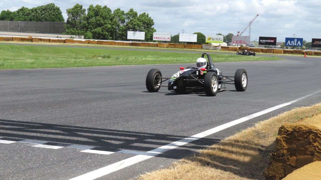 それでも、コースを一周する頃には、恐ろしくクイックな運転感覚に夢中になっていました。手首を5ミリか1センチか動かすだけでノーズは瞬時に向きを変えます。乗用車ならリアが動き出すまで一瞬の「タメ」を待つ必要があるけれど、フォーミュラカーはフロントが動き始めると瞬時にリアタイヤにもスリップアングルが発生する感じ。最終コーナーを注意深く立ち上がり、横方向の動きが消えたのを確認してフルスロットに。30年以上前のスバル製のエンジンは軽い車体を気持ちよく加速させてゆきます。指定された5500回転を前に、5300回転で4速にシフトアップ。身体に風が当たるのが気持ちいい。ブレーキング。アシストがなくてブレーキは重いけど、分かりやすく調整しやすい。ブレーキを抜きながら、操作を重ねる量に気を付けながら、少しずつステアリングを動かし始めると素直に向きを変えてくれます。ものすごく運転しやすい…と思い始めました。