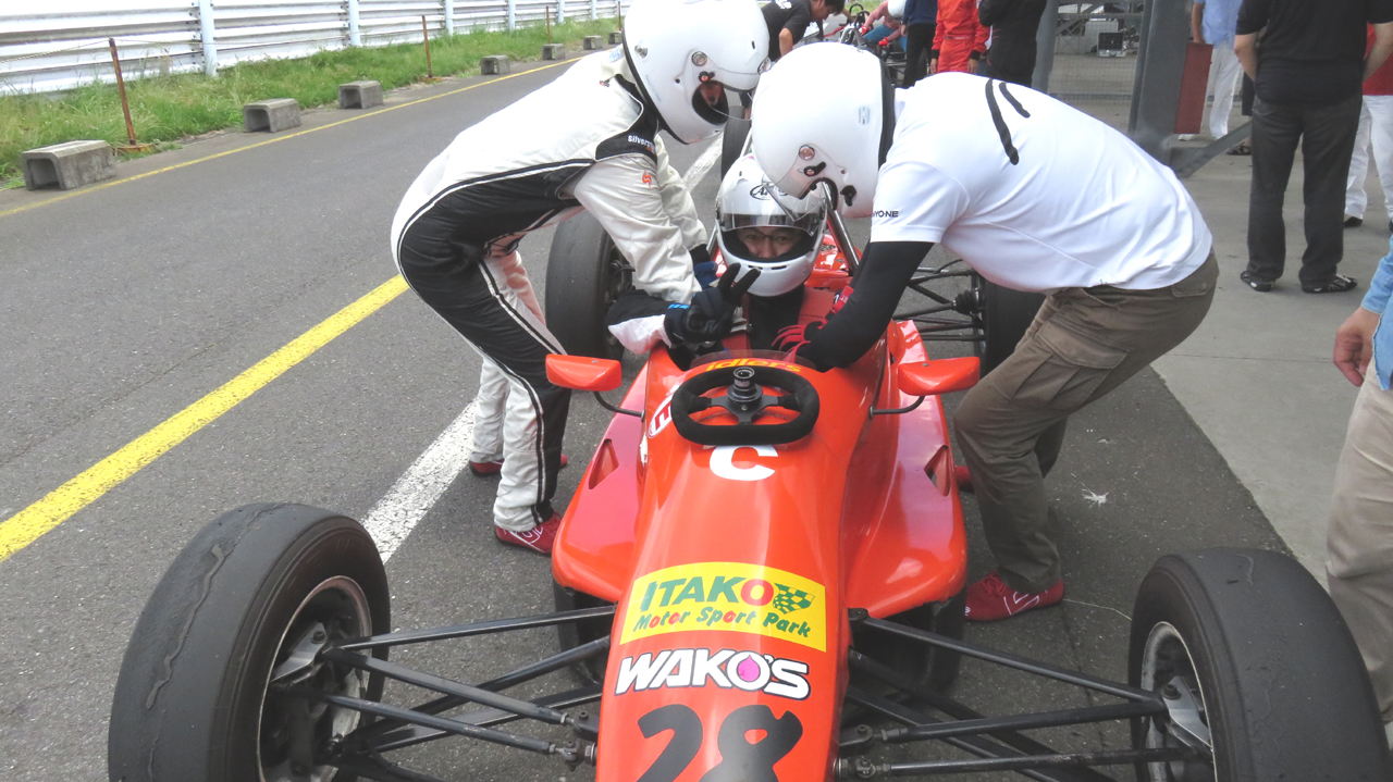 午前中のプログラムが進み、いよいよ自分が乗る順番に。両足を何とか収め、両肩まで収めると、四方八方から手が伸びてきて4点式のシートベルトで締め上げられます。ハコ車では下ろさなかったヘルメットのシールドも下ろすように言われました。すべてが初めての体験。フォーミュラカーってやっぱりすごいんだな…